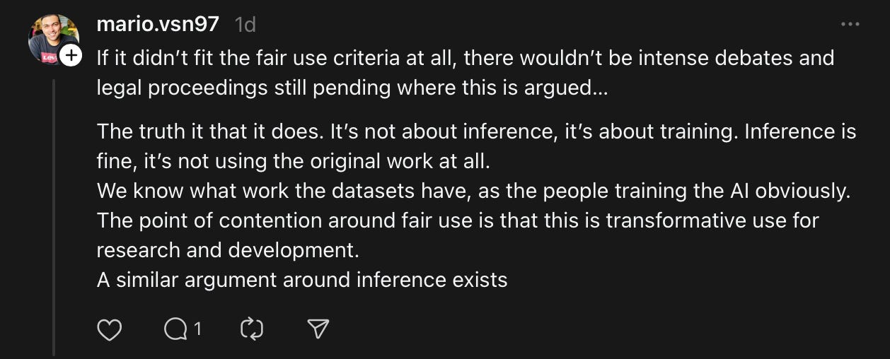The nail in the coffin for the “it’s training” argument is that you can literally get AI models to regurgitate tracts of text out in response to crafted prompts. AI companies view this as an exploit and try to stop it, but it’s been repeatedly shown by researchers that they do memorise and regurgitate text of creative works.