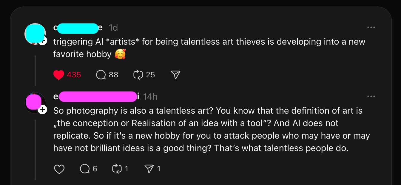 When I challenge people online about AI usage sometimes I get a nice result where they genuinely did not realise the problems with what they were saying and doing. Sometimes we agree to disagree. But there are also some who are flat-out really horrible people.