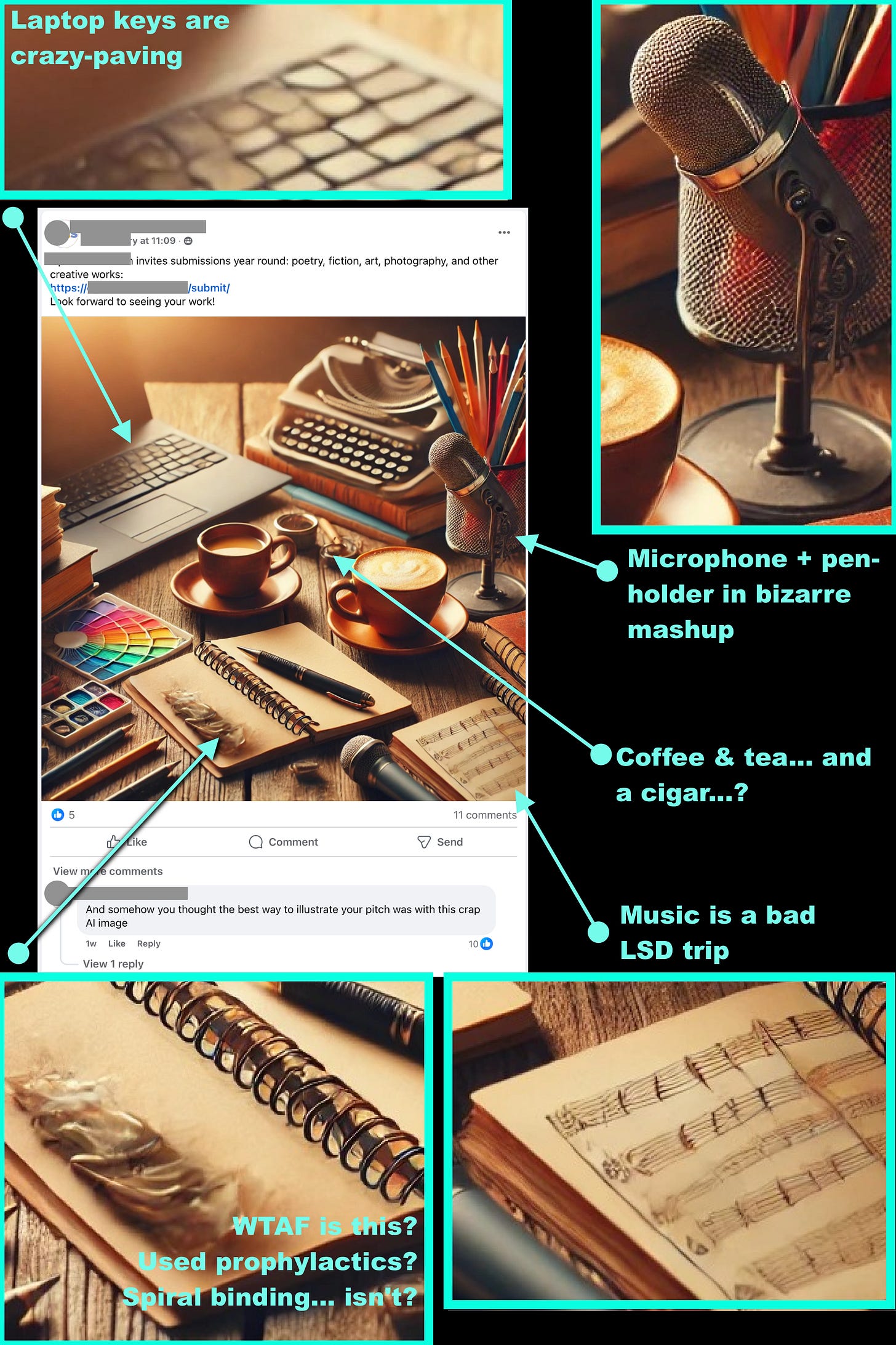 To make this clearer, we know that sometimes people make AI images for other reasons than art. So it’s not true that all AI images are automatically art. Here’s an analysis I did of an AI slop image made for the purpose of selling someone’s services on Facebook. The AI slop image was for sales so not intended to be taken to a gallery or entered in an art competition.