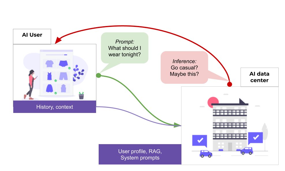 In this diagram I’m an AI user on my phone (top left) with an AI chat product. I send the prompt what should I wear tonight? and I get the result Go casual? Maybe this? A image of clothing choices is sent to my app.