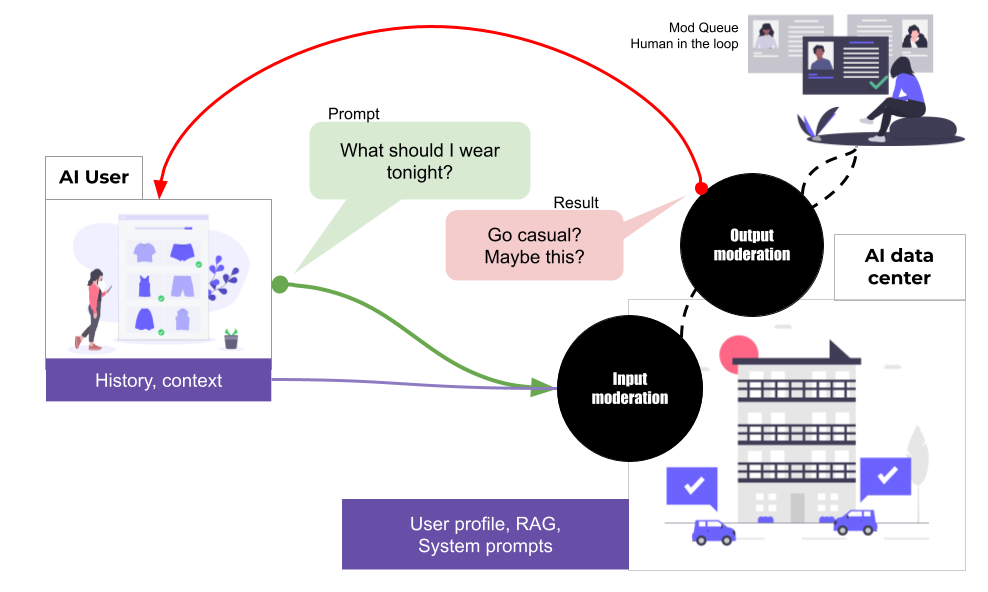 Inputs can be moderated to detect problematic requests like mental health, which AI is not appropriate to deal with; weapons or illegal activities. On the output side, a convolutional neural network (CNN) is trained to detect for example medical or pornographic images. Another tools can detect medical or psychiatric advice. These moderation systems can be modularised and operate on cascade basis, with many different detection topics. If a reject threshold is met then the output is flagged, an error message is shown to the user, and the incident goes on a queue for a human in the loop to look at.
